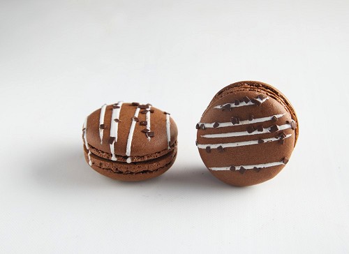 45º Shot of two Brown white Chocolate Caramel macarons on white background