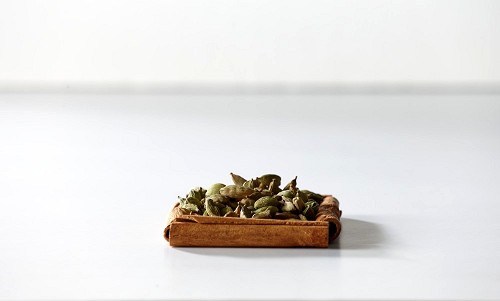 أربعة من أعواد القرفة مكونة شكل مربع بداخلها حبوب الهيل علي خلفية بيضاء