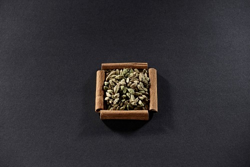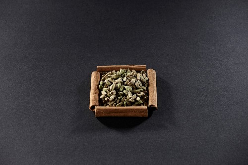 أربعة من أعواد القرفة مكونة شكل مربع بداخلها حبوب الهيل علي خلفية سوداء