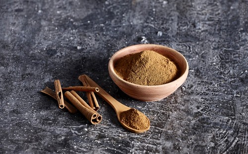 بودرة القرفة في وعاء خشبي وملعقة خشبية ممتلئة به مع أعواد القرفة على خلفية سوداء