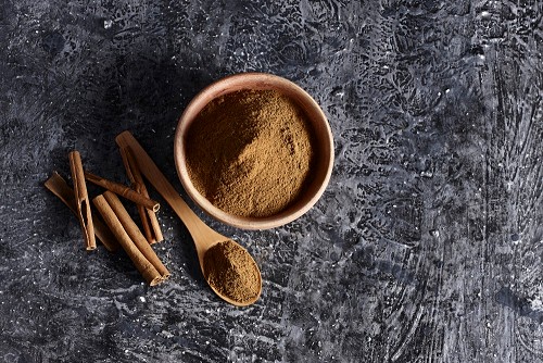بودرة القرفة في وعاء خشبي وملعقة خشبية ممتلئة به مع أعواد القرفة على خلفية سوداء