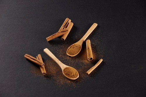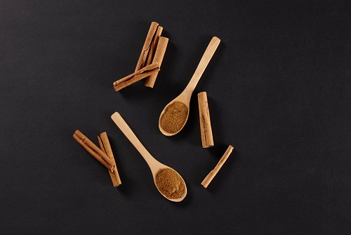 بودرة القرفة في ملعقتين خشبيتين مع أعواد القرفة على خلفية سوداء