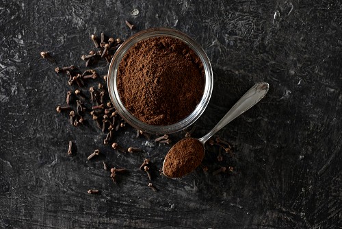 وعاء زجاجي وملعقة معدنية ممتلئان ببودرة القرنفل مع حبوب القرنفل بجانبهما على خلفية سوداء