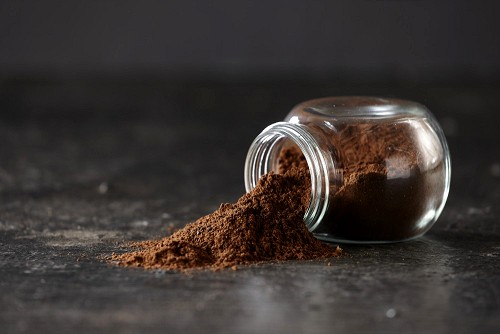 وعاء زجاجي للتوابل مقلوب ممتلئ ببودرة القرنفل والبودرة سقطت منه على أرضية سوداء
