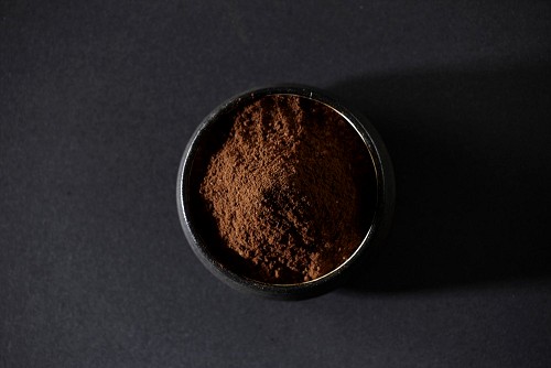 وعاء فخاري أسود ممتلئ ببودرة القرنفل علي خلفية سوداء