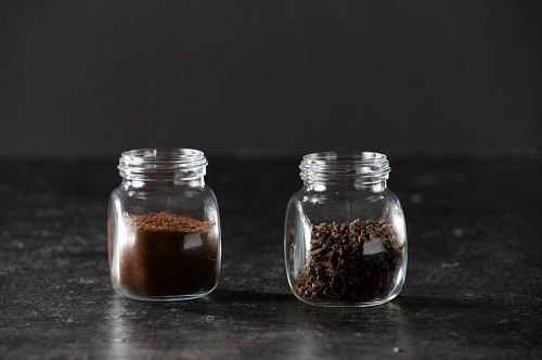 وعاءان زجاجيان ممتلئان بالقرنفل وبودرة القرنفل على أرضية سوداء