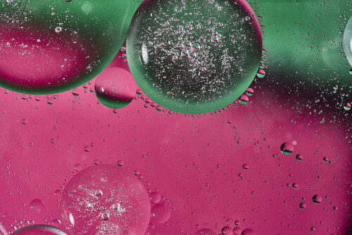 لقطات مقربة لفقاعات من الزيت على سطح الماء باللون الأخضر والوردي