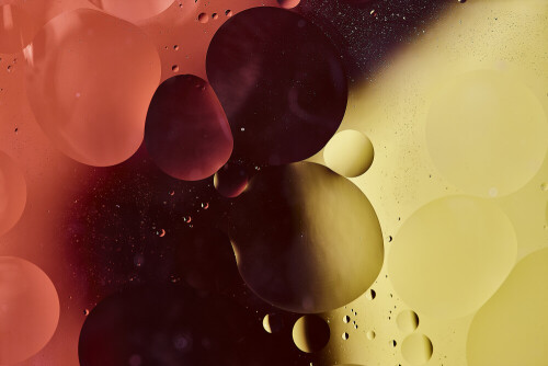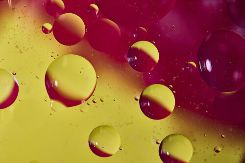 لقطات مقربة لفقاعات من الزيت على سطح الماء باللون الأحمر والأصفر