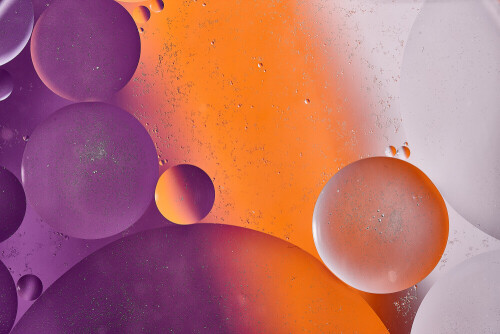 لقطات مقربة لفقاعات من الزيت على سطح الماء باللون الأبيض والبرتقالي والأرجواني