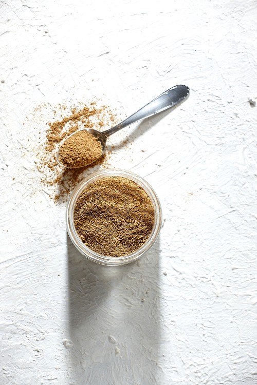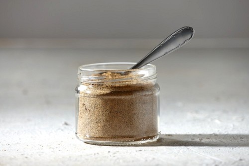 وعاء زجاجي وملعقة معدنية ممتلئة ببودرة الكمون على خلفية بيضاء