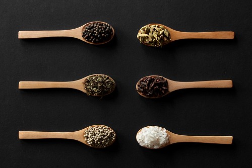الفلفل الأبيض والقرنفل والهيل والملح والفلفل الأسود وريحان مجفف في معالق خشبية علي خلفية سوداء