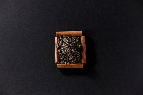 أربعة من أعواد القرفة مكونة شكل مربع بداخلها ريحان مجفف علي خلفية سوداء