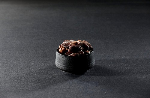 وعاء فخاري أسود ممتلئ بالبلح المجفف على خلفية سوداء