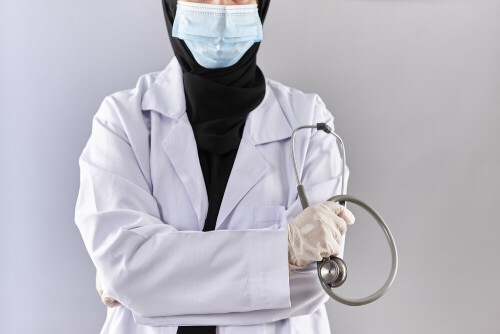 طبيبة ترتدي عباءة وملابس طبية في أوضاع متعددة