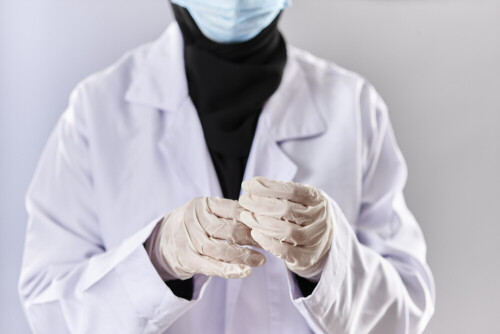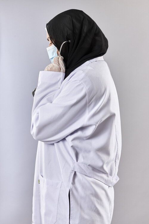 طبيبة ترتدي عباءة وملابس طبية في أوضاع متعددة