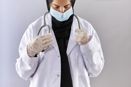طبيبة ترتدي عباءة وملابس طبية في أوضاع متعددة