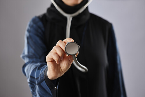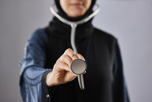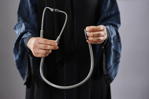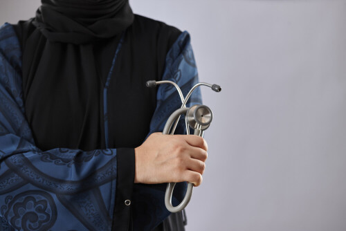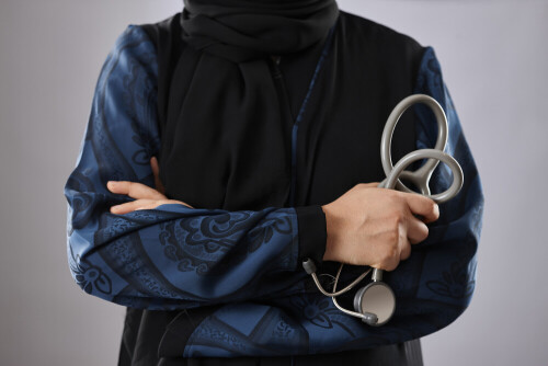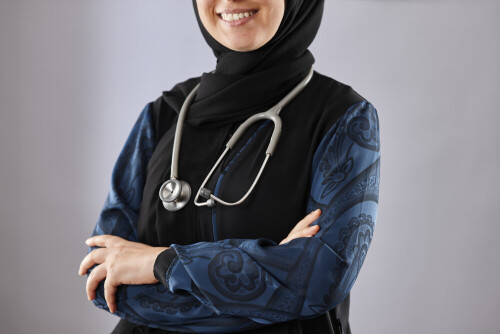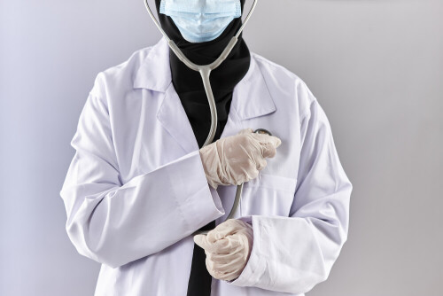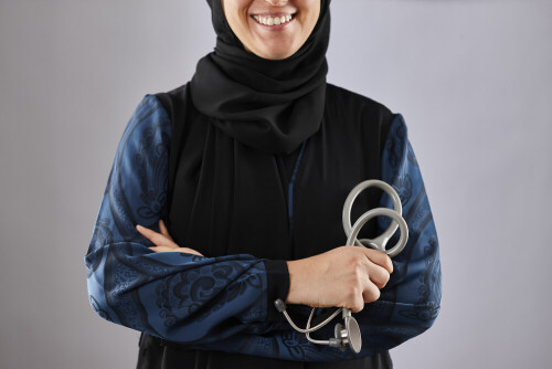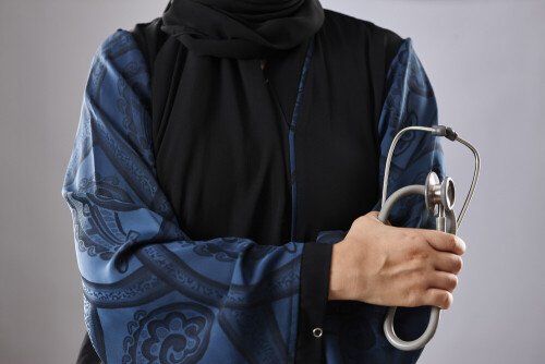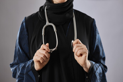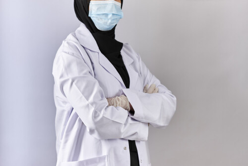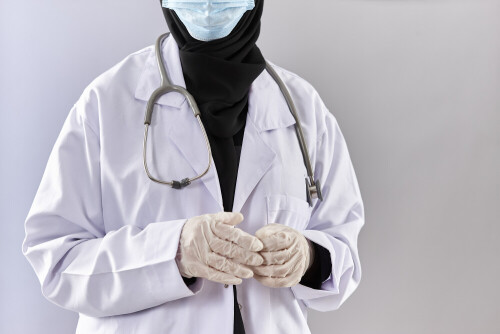 طبيبة ترتدي عباءة وملابس طبية في أوضاع متعددة