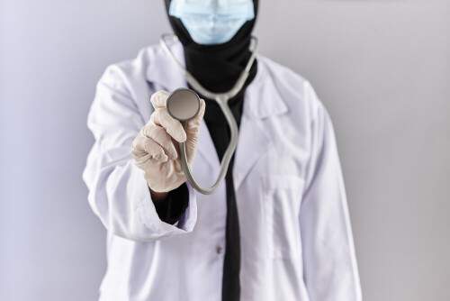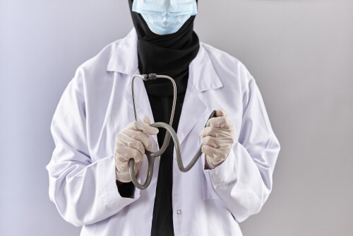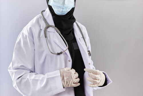 طبيبة ترتدي عباءة وملابس طبية في أوضاع متعددة