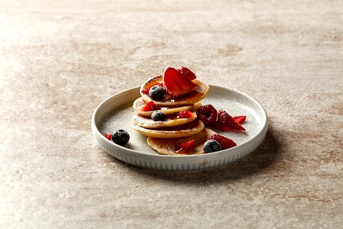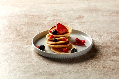 Five stacked mixed berries mini pancakes in a blue plate on beige background
