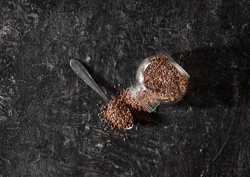 وعاء زجاجي مقلوب ممتلئ بحبوب بذر الكتان والحبوب متناثرة منه مع ملعقة معدنية ممتلئة علي خلفية سوداء
