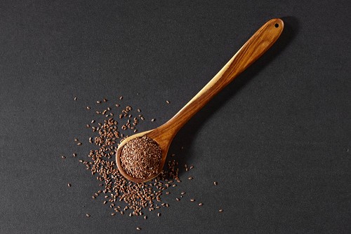 ملعقة خشبية ممتلئة بحبوب بذر الكتان محاطه بالبذور علي خلفية سوداء