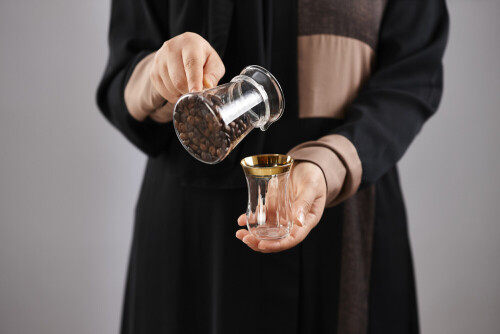 امرأة ترتدي عباءة تحمل أنواع مختلفة من حبوب القهوة في أوضاع متعددة