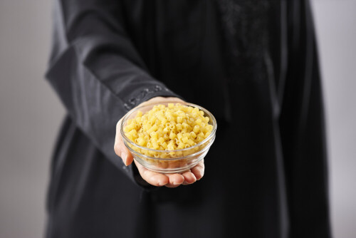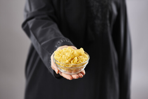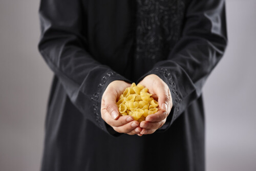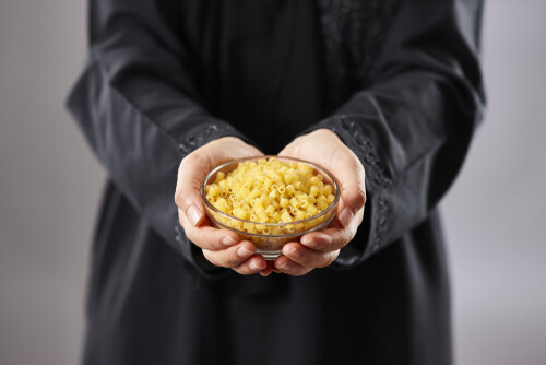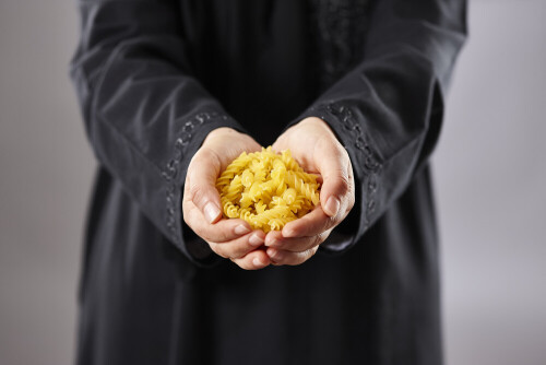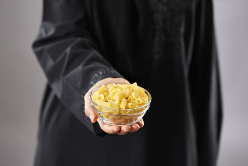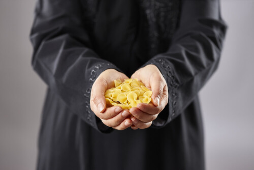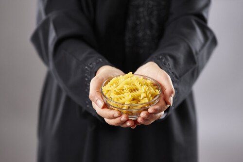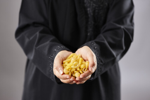 امرأة ترتدي عباءة تحمل أنواع مختلفة من المعكرونة في أوضاع متعددة