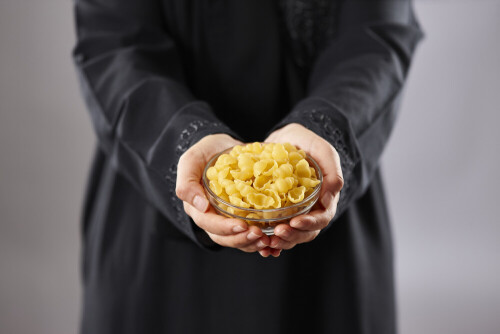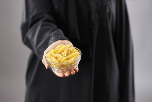 امرأة ترتدي عباءة تحمل أنواع مختلفة من المعكرونة في أوضاع متعددة