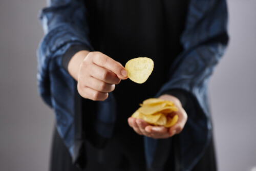 امرأة ترتدي عباءة تحمل أنواع مختلفة من الوجبات الخفيفة في أوضاع متعددة