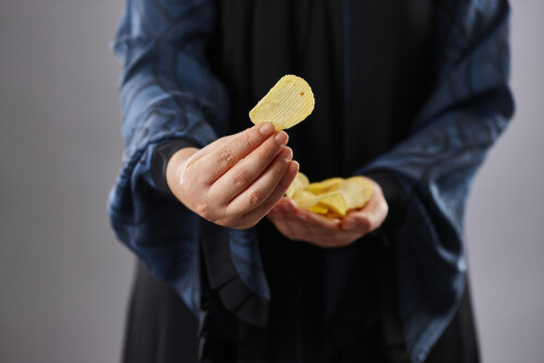 امرأة ترتدي عباءة تحمل أنواع مختلفة من الوجبات الخفيفة في أوضاع متعددة