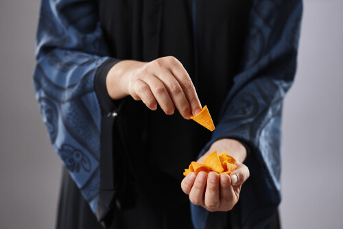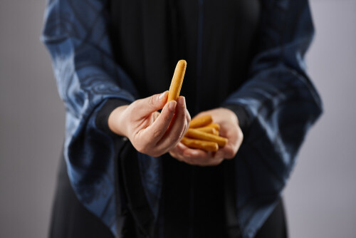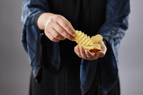 امرأة ترتدي عباءة تحمل أنواع مختلفة من الوجبات الخفيفة في أوضاع متعددة