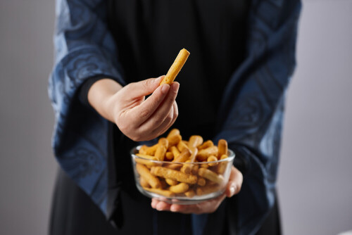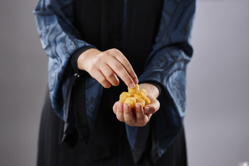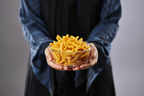 امرأة ترتدي عباءة تحمل أنواع مختلفة من الوجبات الخفيفة في أوضاع متعددة