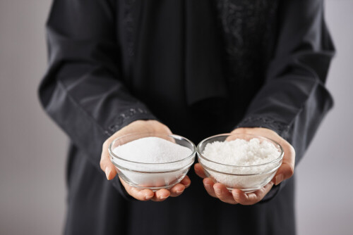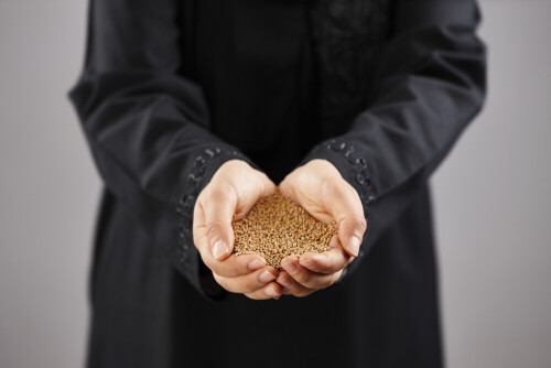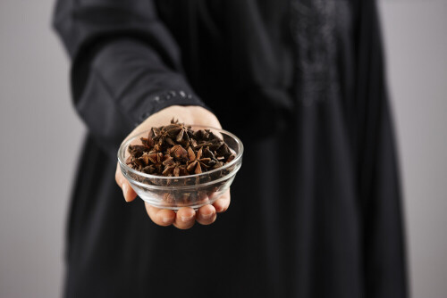 امرأة ترتدي عباءة تحمل أنواع مختلفة من البهارات في أوضاع متعددة