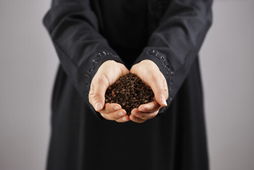 امرأة ترتدي عباءة تحمل أنواع مختلفة من البهارات في أوضاع متعددة