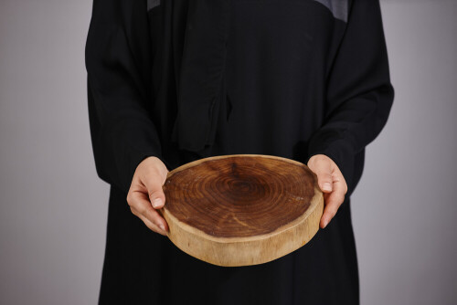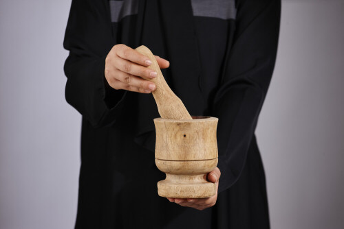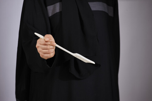 امرأة ترتدي عباءة سوداء تحمل أدوات خشبية مختلفة في أوضاع متعددة