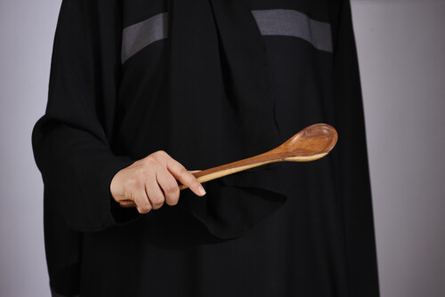 امرأة ترتدي عباءة سوداء تحمل أدوات خشبية مختلفة في أوضاع متعددة
