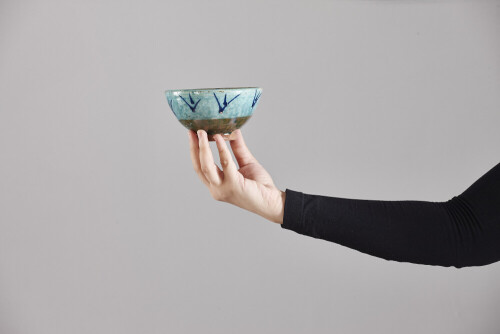 امرأة ترتدي عباءة سوداء تحمل أدوات فخارية مختلفة في أوضاع متعددة