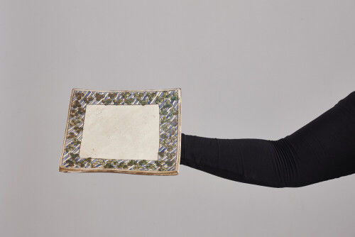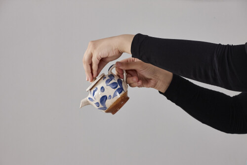 امرأة ترتدي عباءة سوداء تحمل أدوات فخارية مختلفة في أوضاع متعددة