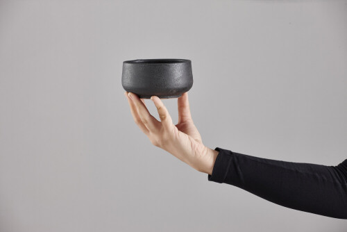 امرأة ترتدي عباءة سوداء تحمل أدوات فخارية مختلفة في أوضاع متعددة