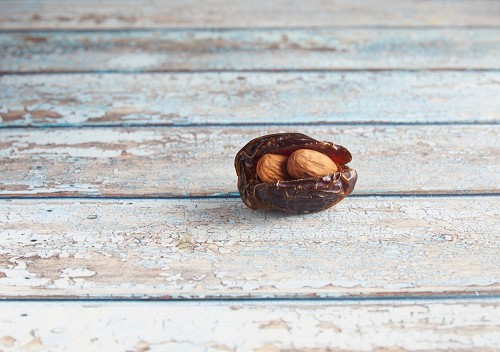hazelnuts stuffed madjoul date on a light blue wooden background
