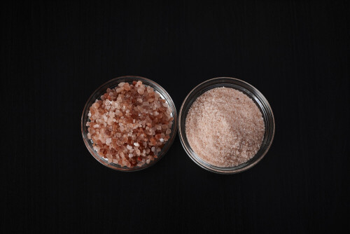 2 وعاء زجاجي احدهمها ممتلئ بملح الهيمالايا الناعم والأخر بملح الهيمالايا الخشن على خلفية بيضاء