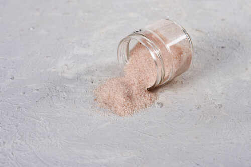 وعاء زجاجي ممتلئ بملح الهيمالايا الناعم على خلفية بيضاء