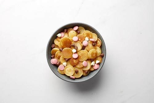 Top-view shot of mixed chocolate chips cereal pancakes in a round bowl on white background