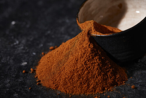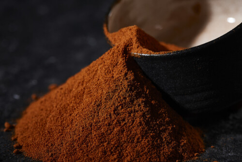 وعاء فخاري أسود ممتلئ ببودرة البابريكا مقلوب وتناثر منه بعض البودرة علي خلفية سوداء