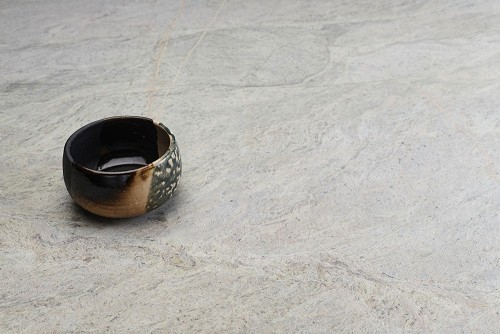 وعاء فخاري متعدد الألوان على خلفية من الرخام الرمادي