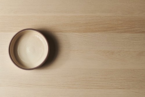 وعاء فرن فخاري باللون البيج على خلفية خشبية فاتحة