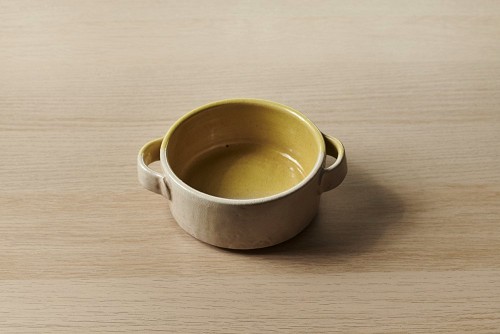 وعاء فخاري متعدد الألوان على خلفية خشبية فاتحة