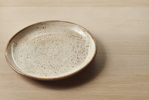 طبق من الفخار باللون البيج على خلفية خشبية فاتحة