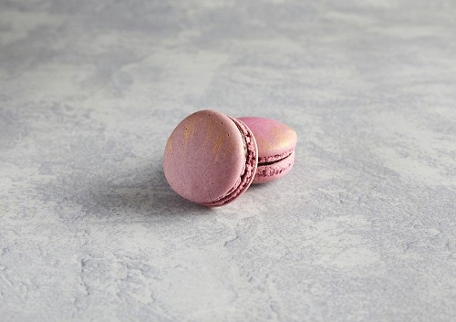 45º Shot of two Purple Strawberry macarons on white  marble background
