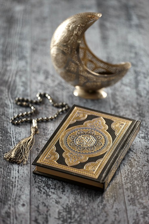 فانوس فضي مع مشروبات مختلفة وتمر ومكسرات وسبحة صلاة وقرآن على خلفية خشبية رمادية
